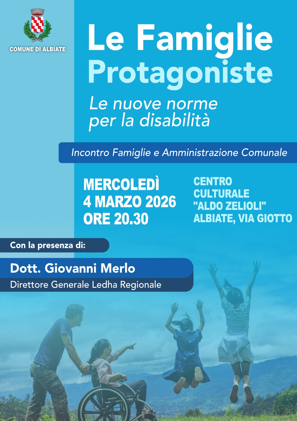 Il Comune di Albiate vi invita a una serata di ascolto e confronto sui servizi per la disabilità. Vogliamo raccogliere le vostre riflessioni, ascoltare le vostre storie e progettare insieme servizi sempre più adeguati e sostenibili per le persone con disabilità e le loro famiglie.